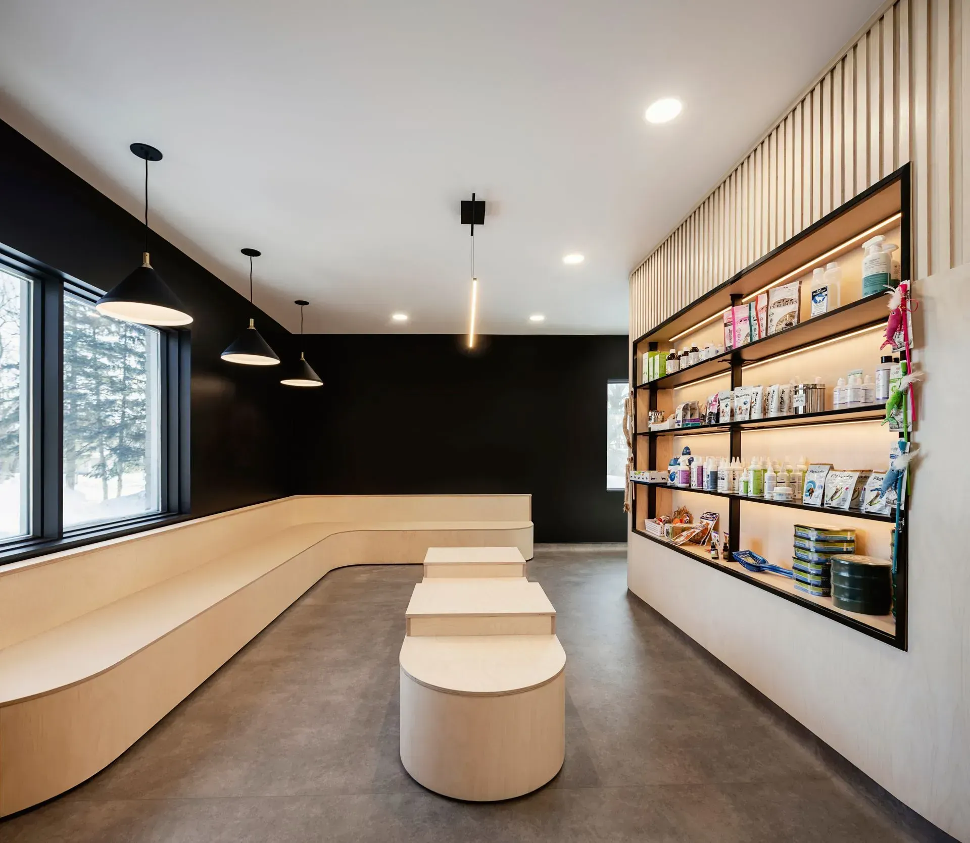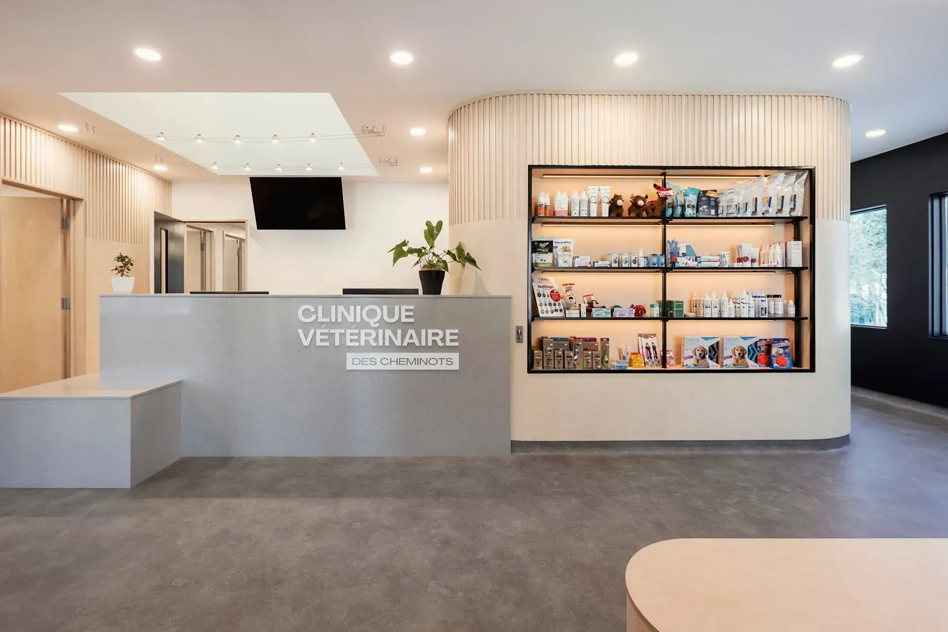 Ce projet de clinique vétérinaire se distingue par sa belle luminosité et son utilisation harmonieuse du bois, offrant une atmosphère chaleureuse et accueillante. Avec l’ajout de la plomberie dans la dalle, la mise en œuvre de systèmes de gaz médical, d’équipements de radiographie et de dentisterie sur mesure, ainsi que la construction d’un chenil en acier inoxydable, l’adaptation par fonction est une caractéristique clé de ce projet, réalisé tout en minutie. De plus, la marquise neuve, l’ascenseur, le laboratoire et le système de ventilation améliorent à la fois la fonctionnalité, mais aussi le confort des occupants à quatre ou à deux pattes.