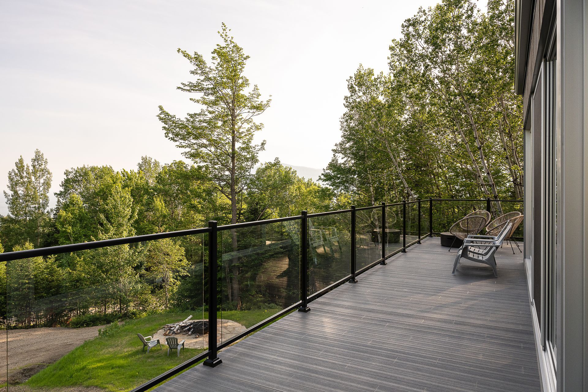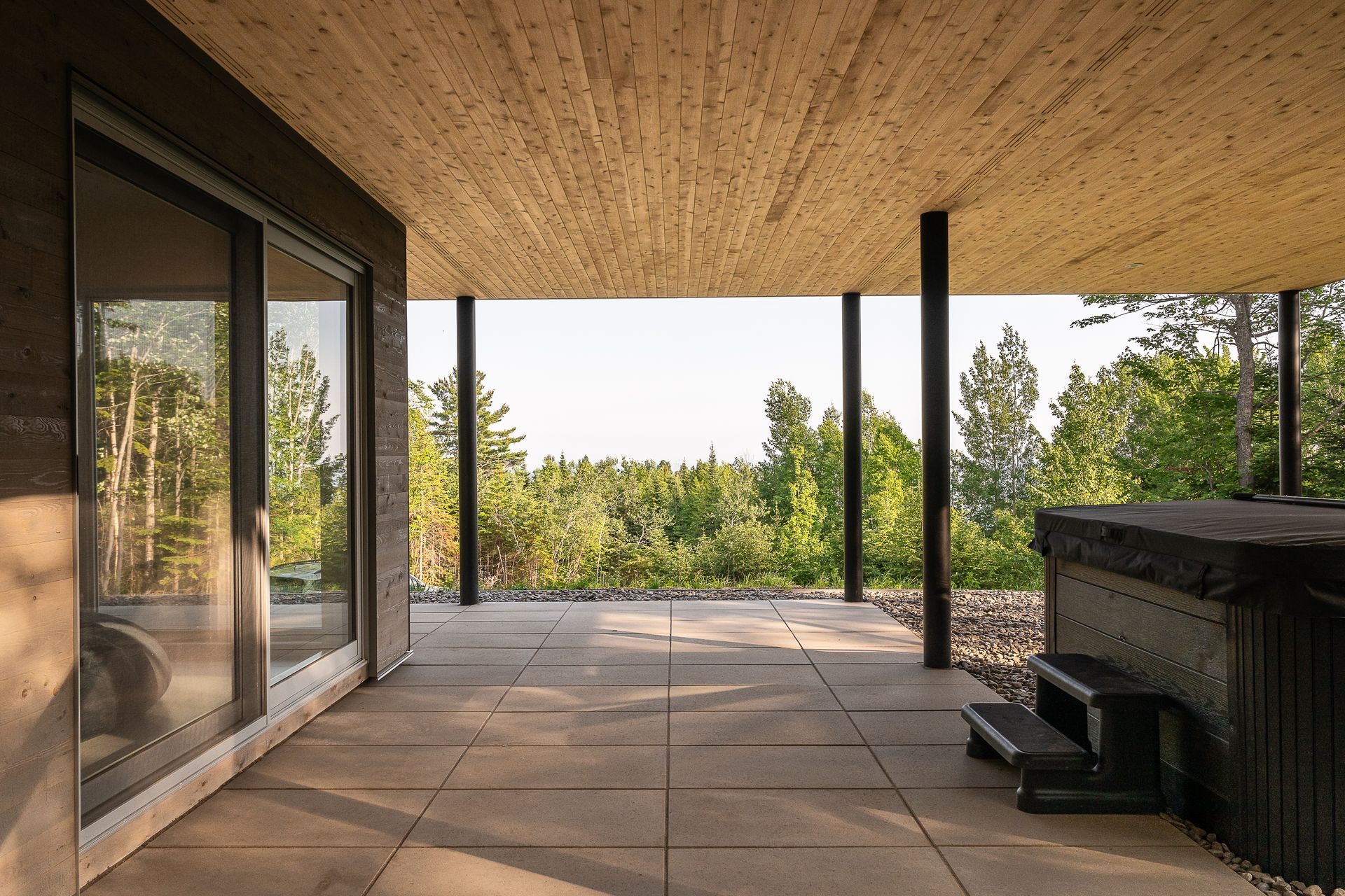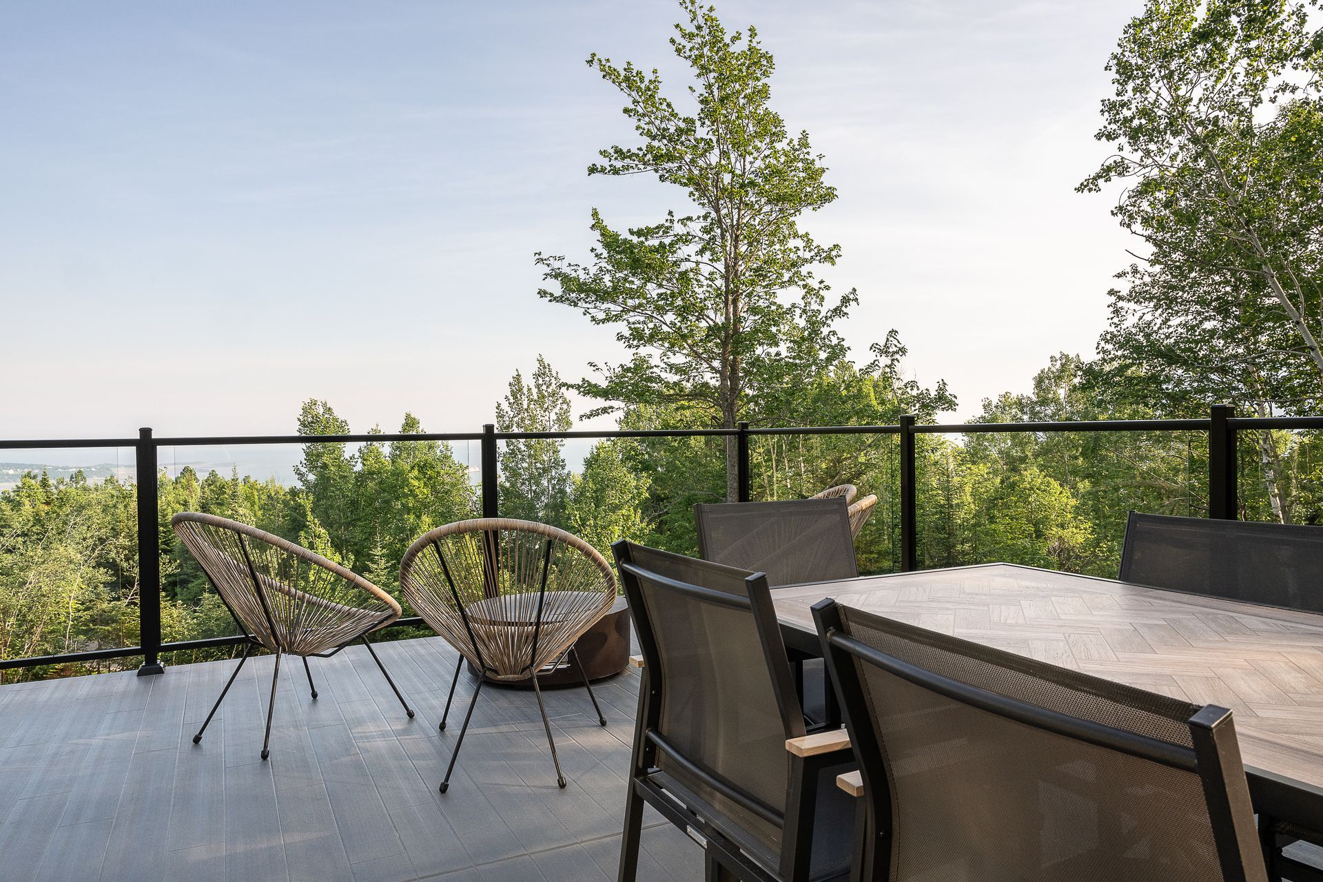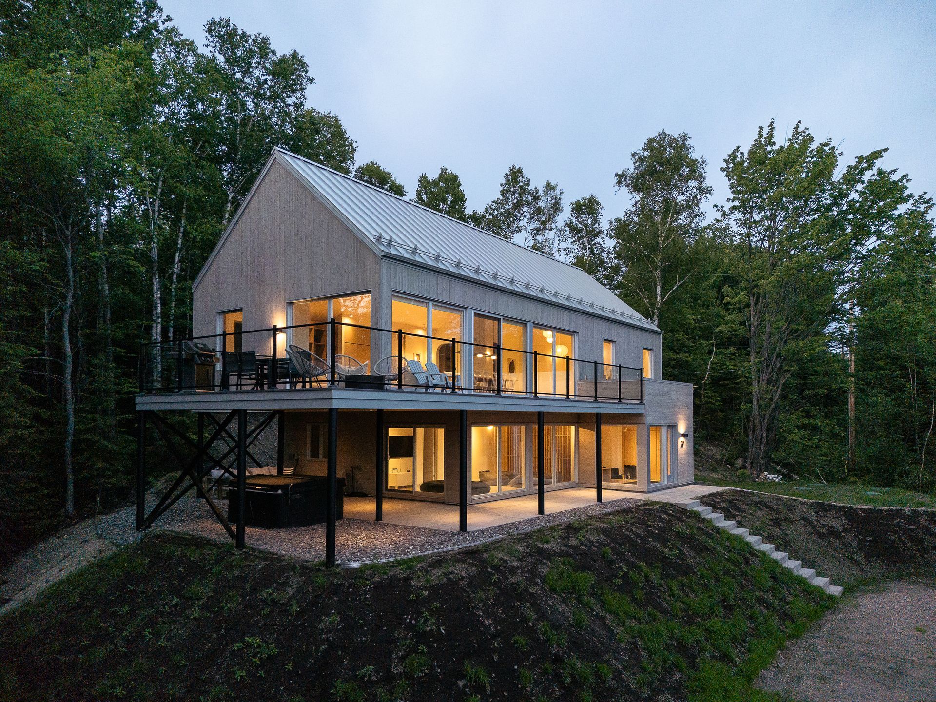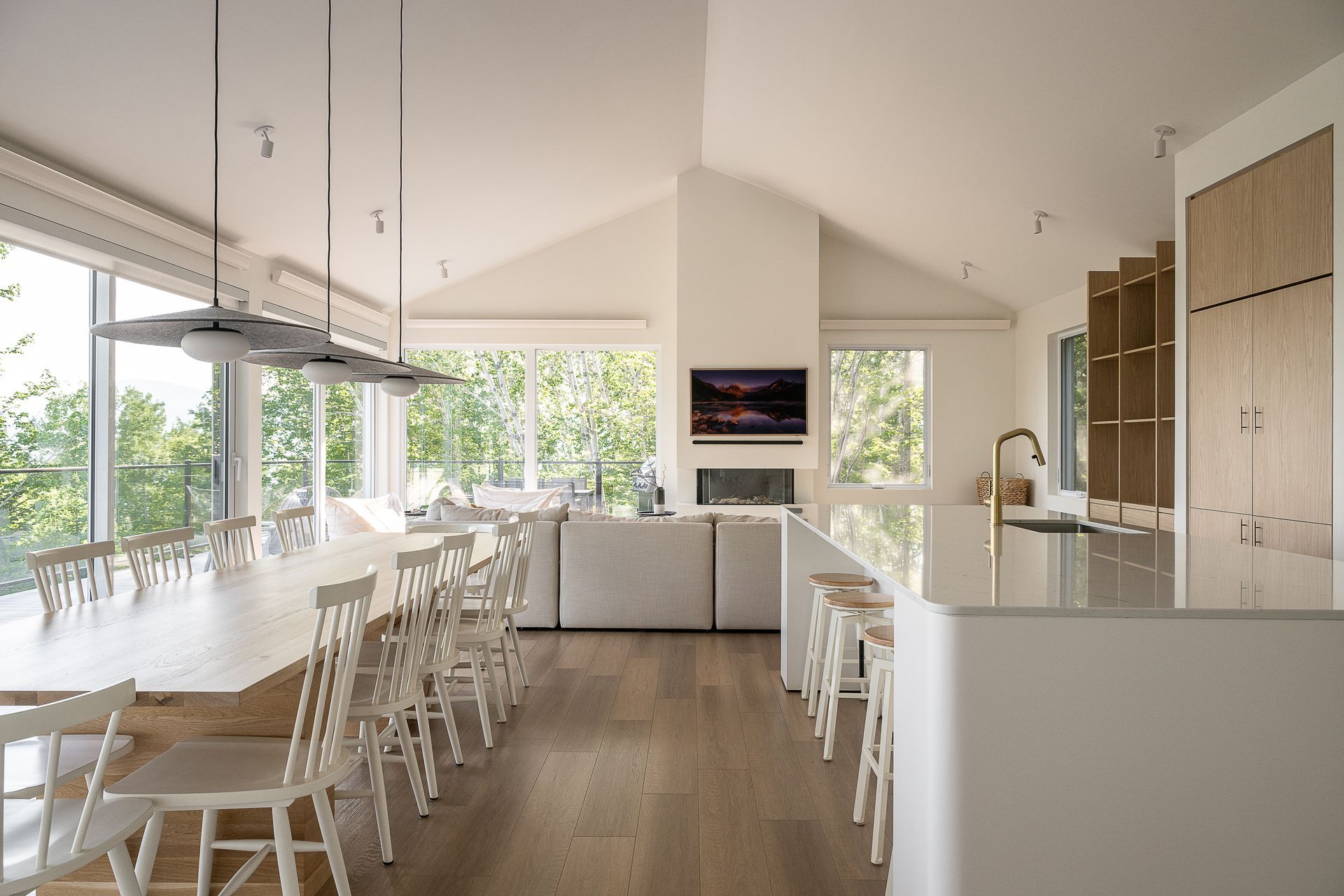 Les larges fenêtres, encadrant la vue sur le paysage environnant, invitent la nature à l’intérieur, rendant l’espace encore plus lumineux et ouvert. Une parfaite fusion de design scandinave et contemporain, qui crée une atmosphère sereine et accueillante, idéale pour se ressourcer en pleine nature.